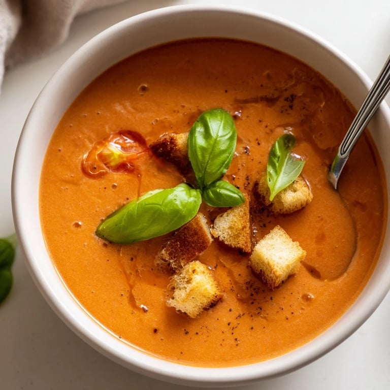 - Fresh basil and croutons (garnish): These finish the soup with color and texture, turning it from simple to presentation-worthy.