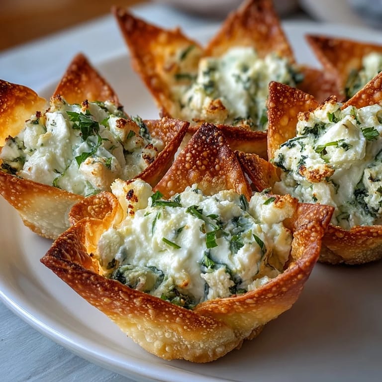 Pin It My neighbor showed up to a potluck with these little golden cups, and I watched them disappear in minutes—people were literally fighting over the last few. She wouldn't give up the recipe that night, but months later, feeling generous, she texted me a photo of her muffin tin with the note 'You're ready.' Turns out the magic isn't complicated, just wonton wrappers baked until crispy, then filled with this creamy, garlicky spinach and feta mixture that tastes way fancier than it has any right to. Now I make them whenever I need to feel like I've got my life together, which is more often than I'd like to admit.