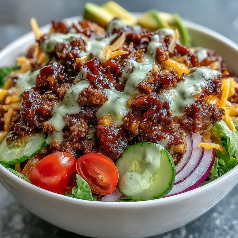 Pin It My coworker brought one of these bowls to work last summer, and I spent the entire lunch break staring at her container instead of eating my own sad salad. The way the crispy lettuce cradled all those cheeseburger toppings without the bun weight—it clicked instantly. I went home that evening and made four servings for the week ahead. Now it's the recipe I actually look forward to meal prepping on Sundays.