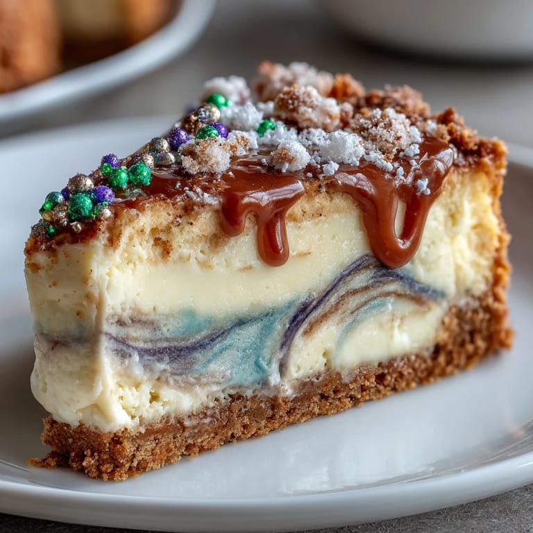 Pin It The first time I made these King Cake Cheesecake Bars, I was honestly trying to solve a problem: I had leftover cream cheese from another project and a friend's Mardi Gras party invitation on my calendar. What started as a desperate attempt to combine two completely different desserts somehow became the thing everyone asks me to bring now. The swirled colors caught everyone's eye before anyone even tasted them, but it's that buttery cinnamon crust meeting the silky cheesecake layer that keeps people coming back for seconds.
