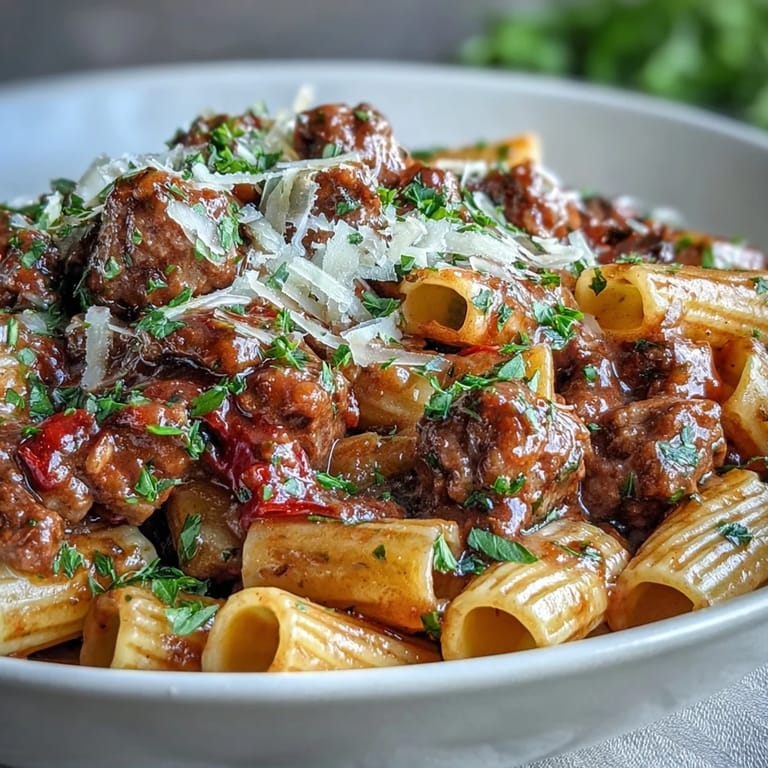 Pin It There's something about a weeknight when everything feels rushed—work ran late, the kids are hungry, and you've got maybe thirty minutes to pull dinner together. That's when I discovered the magic of throwing everything into one pot and letting it do the heavy lifting. This creamy red wine sausage pasta emerged from pure necessity, but it stuck around because it tasted like I'd been cooking for hours when really, I'd barely lifted a finger. The wine adds this sophisticated depth that makes it feel fancy, even though your kitchen is probably still a mess from the day.